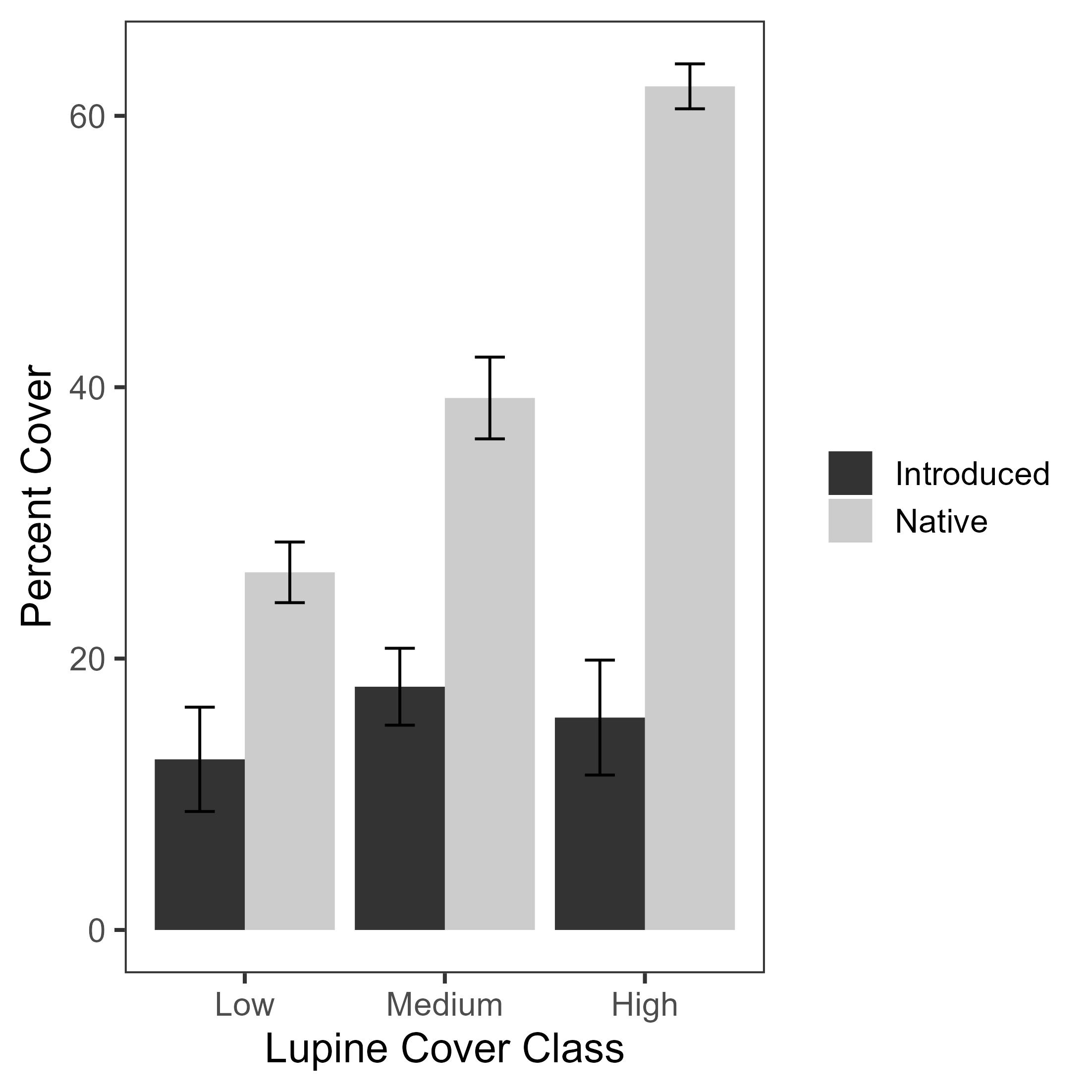 Figure 2, below, shows increased cover of native plants with increasing lupine cover class, but not so for cover of introduced species.